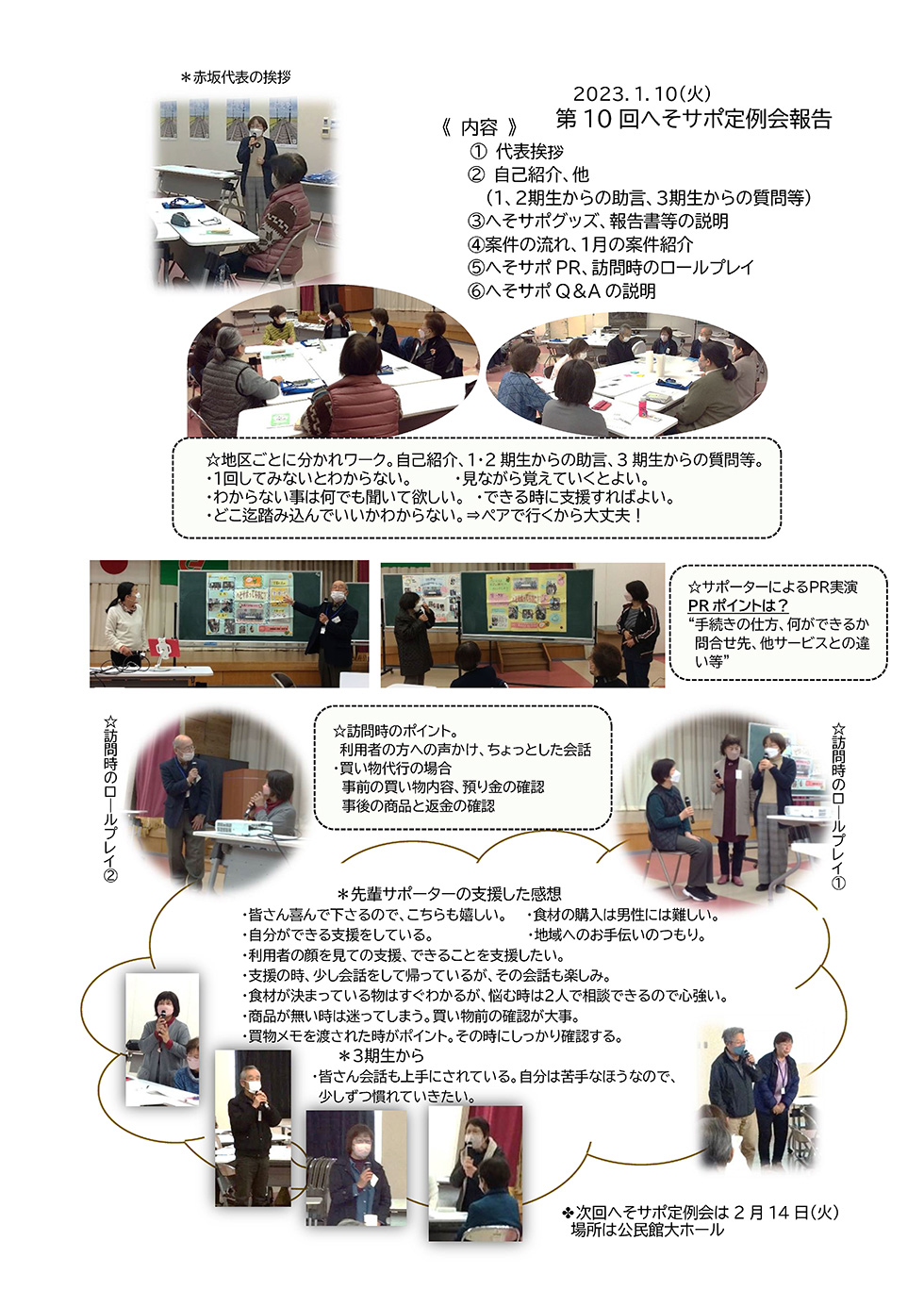 今回から3期生も合流です。地区ごとのテーブル内での自己紹介や1・2期生から3期生のみなさんへのメッセージ。ごみ出しや買物のロールプレイングもあり、真剣かつ笑顔あふれる定例会となりました。